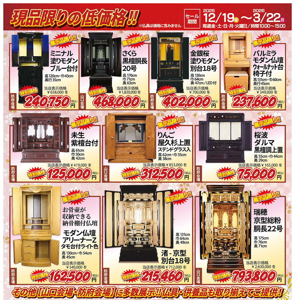 展示品限りの特別価格!お仏壇売りつくし市開催!(セール:2025.12.19~)