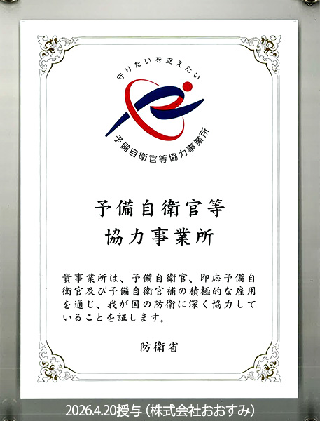 このたび株式会社おおすみは、予備自衛官および即応予備自衛官、予備自衛官補の雇用や活動への理解と協力が評価され、防衛省より「予備自衛官等協力事業所」として認定されました。